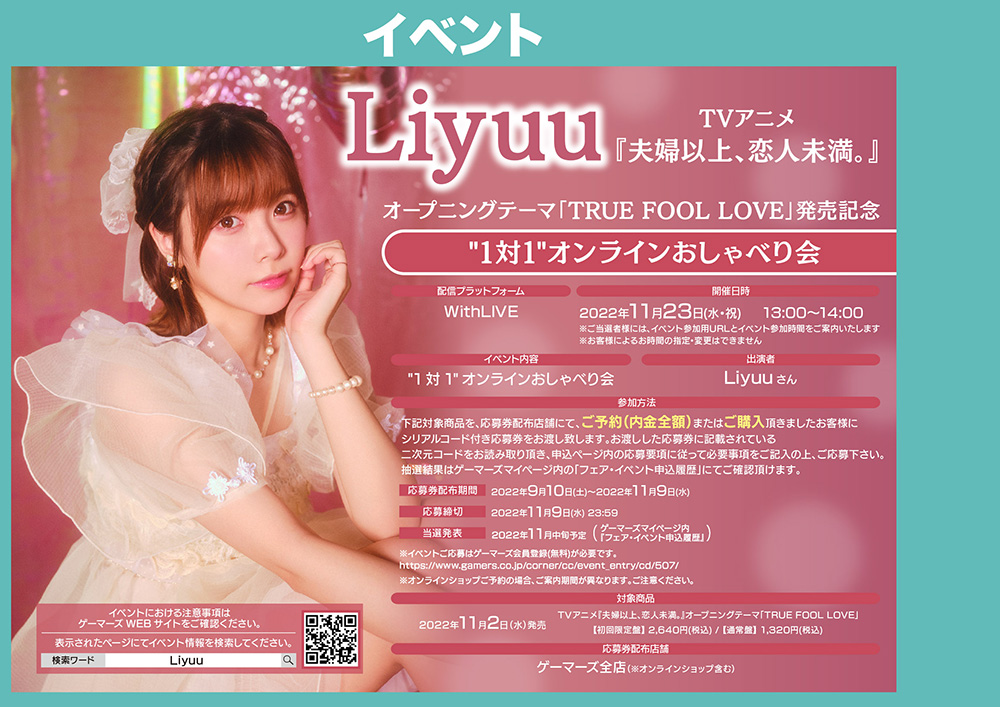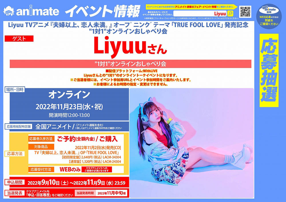 Liyuu TVアニメ『夫婦以上、恋人未満。』オープニングテーマ「TRUE FOOL LOVE」発売記念"1対1"オンラインおしゃべり会