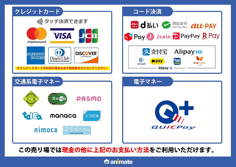 ・お支払いは、現金または下記クレジットカード・電子マネー・バーコード決済等をご利用いただけます。
