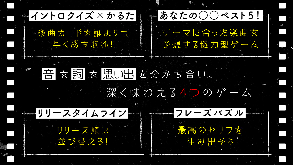 ~「音」を「詞」を「思い出」を分かち合い、深く味わえる~ をコンセプトにした音楽カードゲームです。音、歌詞、楽曲情報を活用した4種類のゲームを収録しております。