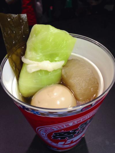 よ~く煮汁の沁みた大根、玉子、さつまあげ、こんにゃく、ロールキャベツにこんぶと、おでんの定番メニューをぎゅっと詰め込みました!