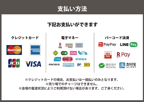 ※会場でのチャージ・充電はできません。事前に残高のご確認・チャージ等をお願いいたします。