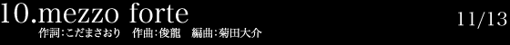 いよいよこのアルバムも終盤に近づいてまいりました。まったく勝手な見解ながら、アルバムの全体のテーマとしては、生きる上での強さ、弱さとは何だろう? といったことがあるように私は思っています(違っていたらごめんなさい)。そういう意味でいえば、「mezzo forte」というタイトルを持ったこの曲は、ここまでの曲で繰り返し書かれてきたテーマをひとつに纏める、重要な役割を担っているのではないでしょうか? その結論は、聴けば「なるほど!」と誰もが納得できるはず。茅原さんに導かれてきた「Contact」の旅とも、そろそろお別れです。