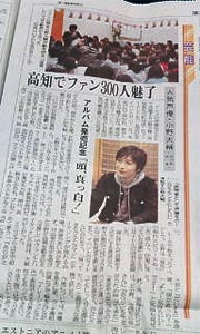 皆さん「高知こいよ!」(笑) お元気でしょうか?すっかりと春の陽気になり、気持ちのいい季節ですね。 こんな気候の中で聞く「春空」もまた格別かと思います! さて、遅くなってしまいましたが3月21日に行われた「小野大輔さん1STアルバム」 キャンペーンのレポートを上げさせていただきます。 今回、小野さんの出身地高知でキャンペーンさせていただき本当に良かったです。 キャンペーンを実現させていただきました関係者様にこの場をかりて御礼申し上げます。 ありがとうございました。 さて、当日は珍しく晴天!! 東京ではまだ咲いていなかった桜が高知では早くも咲いていて ぽかぽか陽気のなか羽田から降り立った小野大輔一行…。 ハイテンションなマネージャーさんとランティススタッフに若干ついていけてない小野さん…。 どうやら少し緊張のご様子…。 「駅が新しくなってる!」「ここは有名なレストランでね・・・」 タクシーで移動中に昔話をポツリポツリとしながら会場へ向かう。 会場へ到着。さっそく会場内をチェックして歌リハを何度も何度もやる。 「”ノスタルジア”は緊張しますね・・・。何度も歌っているのに」 そんなことをいいながら 何ども歌っている。 地元ということもあり、ご親戚の方が楽屋にご挨拶に来て思わず 「どうしたん…」と土佐弁に思わずなってしまう小野さんなのでした。 本番! 当日は300名ものファンの方が全国から駆けつけてくださいました! 小野さんとPVにもあった宝探しを会場の皆様と一緒にさせてもらい 小野さんとハイタッチ!やみんなで「もす!」と叫んでいただいたり いろいろやらせて皆様ごめんなさい。楽しんでいただけていたでしょうか…。 そして、最後のオチ「だいすき」歌唱(小野さんにはシークレットで突然歌ってもらいました。) も決まって!宝さがしコーナーは大盛況に終わることができました。 ご協力いただいた皆様、ありがとうございました! 最後はミニライブ! ノスタルジア、春空、「ありがとう」の3曲を歌いました。 なんだかいつもに増して緊張している小野さんでしたが皆さんの温かい手拍子にのせて歌うことができました。 そして最後の曲「ありがとう」では小野さんが歌いながら涙する場面も…。 生まれ育った高知で「ありがとう」を歌うことは考え深いですねと歌い終わった後に応援してくれるみなさんに、家族に、スタッフに心からの感謝の言葉を伝えていました。 皆さんの温かい心にふれて、生まれ育った高知で小野さんはとっても輝いていましたよ。 皆さん本当にありがとうございました! 当日は高知新聞さんが取材に来てくださって、後日記事載せていただきました。 高知新聞さんありがとうございました! そして、終わった後は地元の高知料理をいただいて乾杯したのです! 皿鉢料理からくじらまでスタッフともどもおいしく頂きました! 今回は出身地のみのキャンペーンでしたが本当に温かい心にふれたイベントだったと 小野さんも喜んでいました また、ぜひやりたい!と思っていますので皆さん変わらぬ応援よろしくお願いいたします。 参加していただいた皆様ありがとうございます! それまで、みなさん「高知こいよ!」です。 ちなみに、タイトルで使用した写真は、イベントの時に小野さんが一番お気に入りなのに世の中に出ていなかったお写真です。 皆様に見せますとお約束したので!