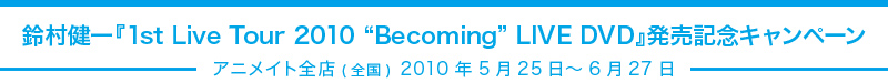 鈴村健一 『1st Live Tour 2010 “Becoming” LIVE DVD』をアニメイト各店にてご予約もしくはご購入下さいましたお客様に、キャンペーン応募用紙をお渡しいたします。※応募用紙は商品とご一緒にお渡しいたします。